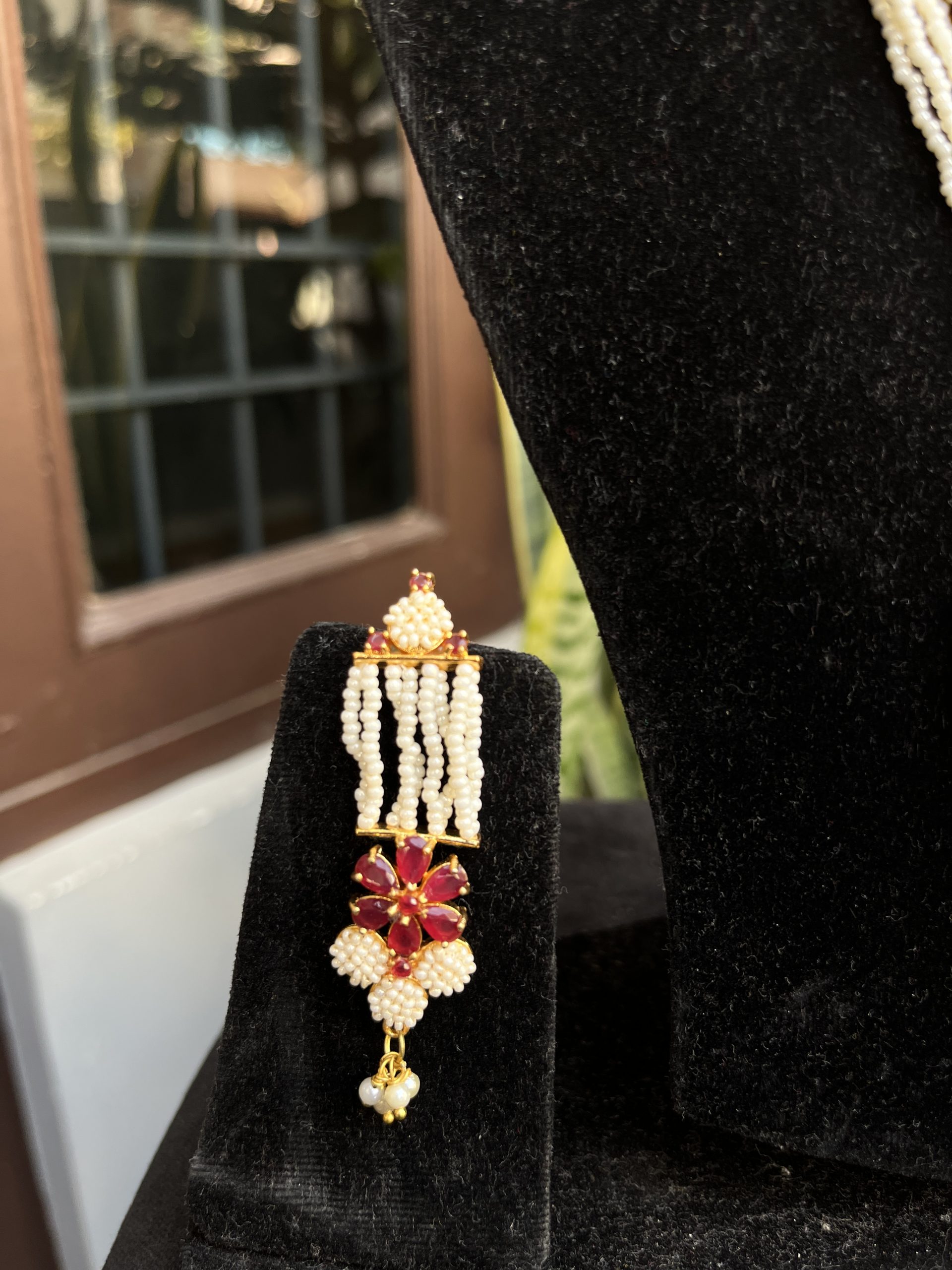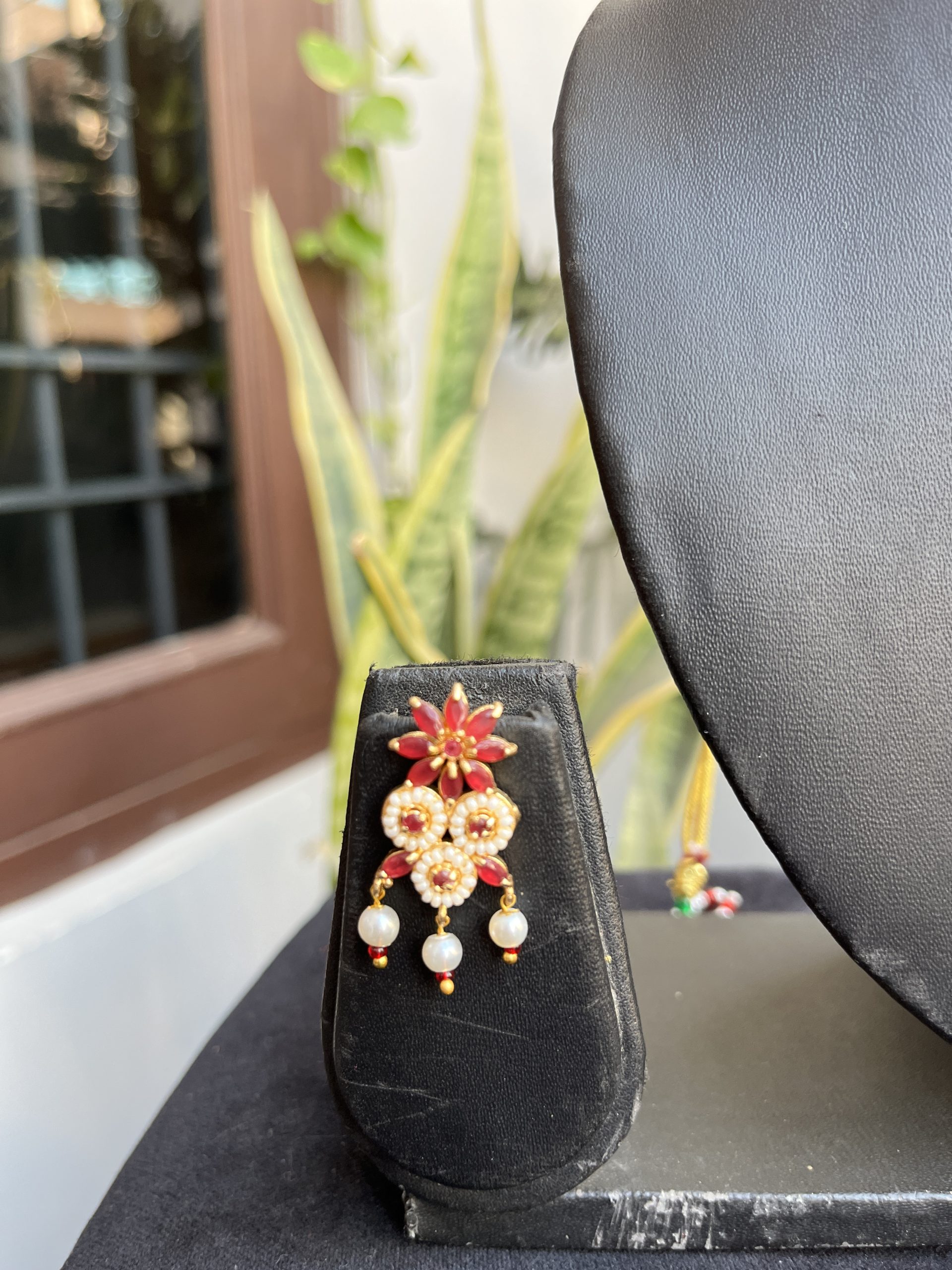 Indian Mores Pearls And Red Stone Studded Flower Design Mangtikkka Borla For Girls And Women