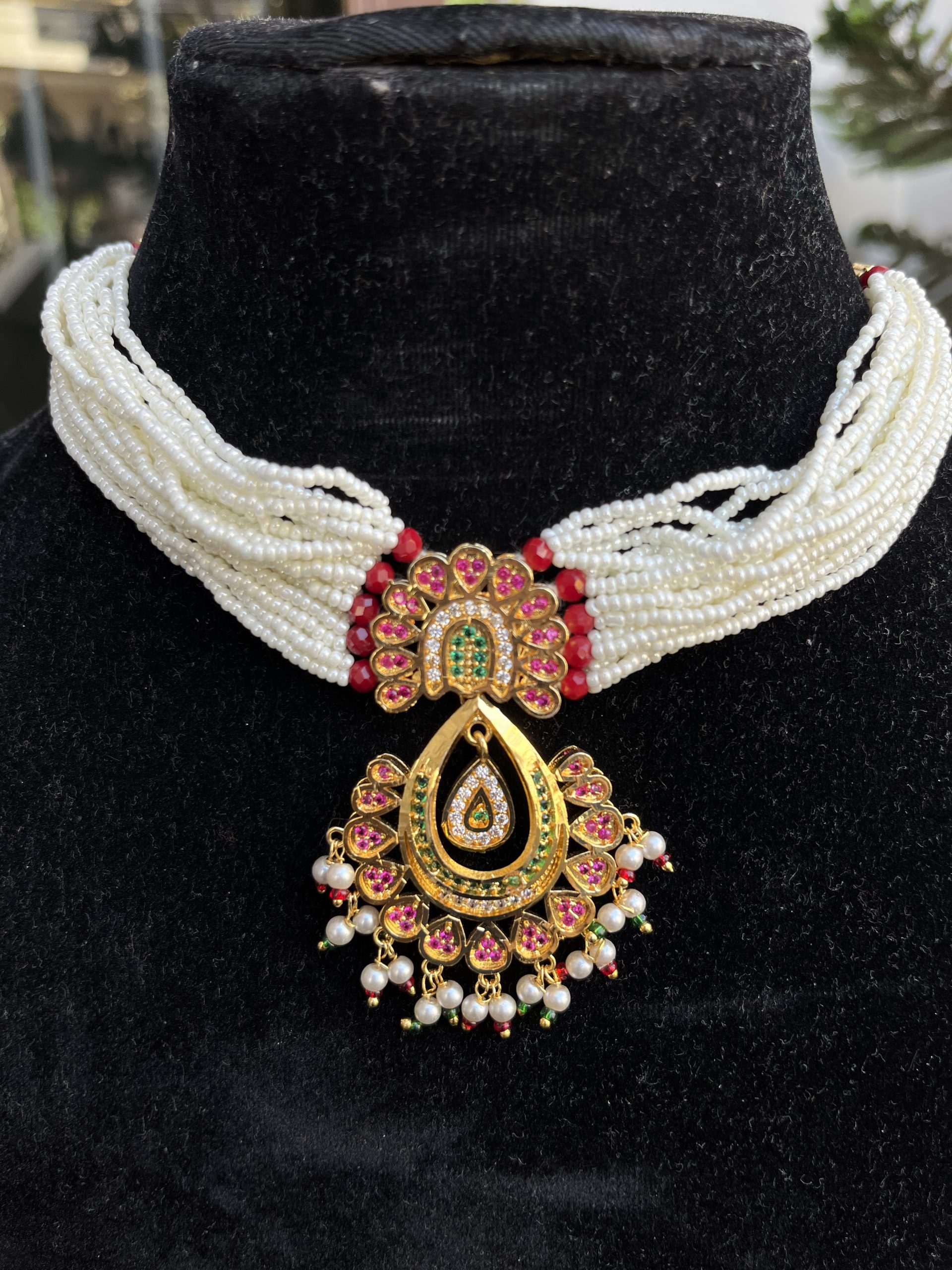 Indian Mores Rajasthani Traditional Jadau Pendant with Chidmoti Chokar Set