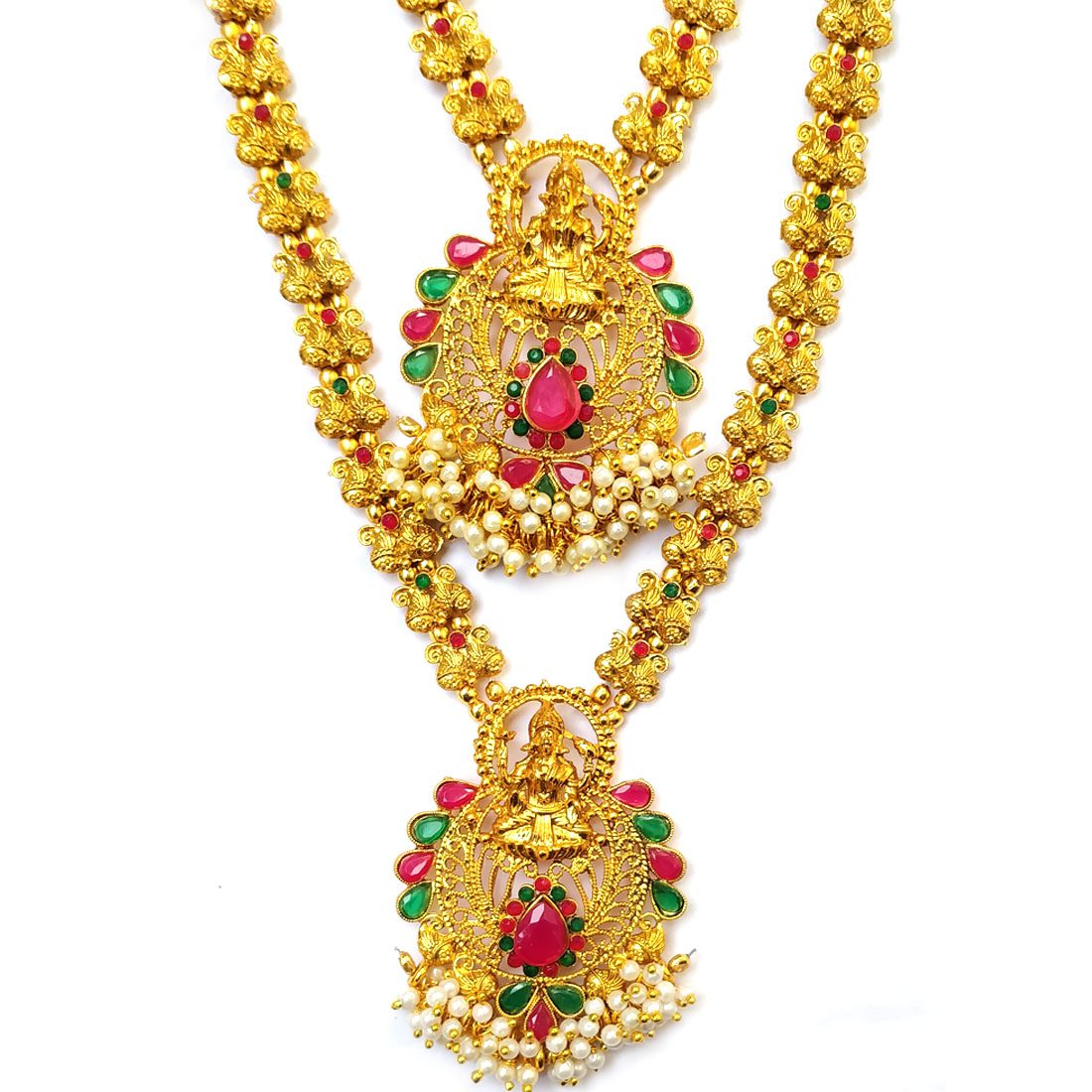 Pearls and Kundan Studded Traditional Two Layer Temple Jewellery Necklace Pendant Set
